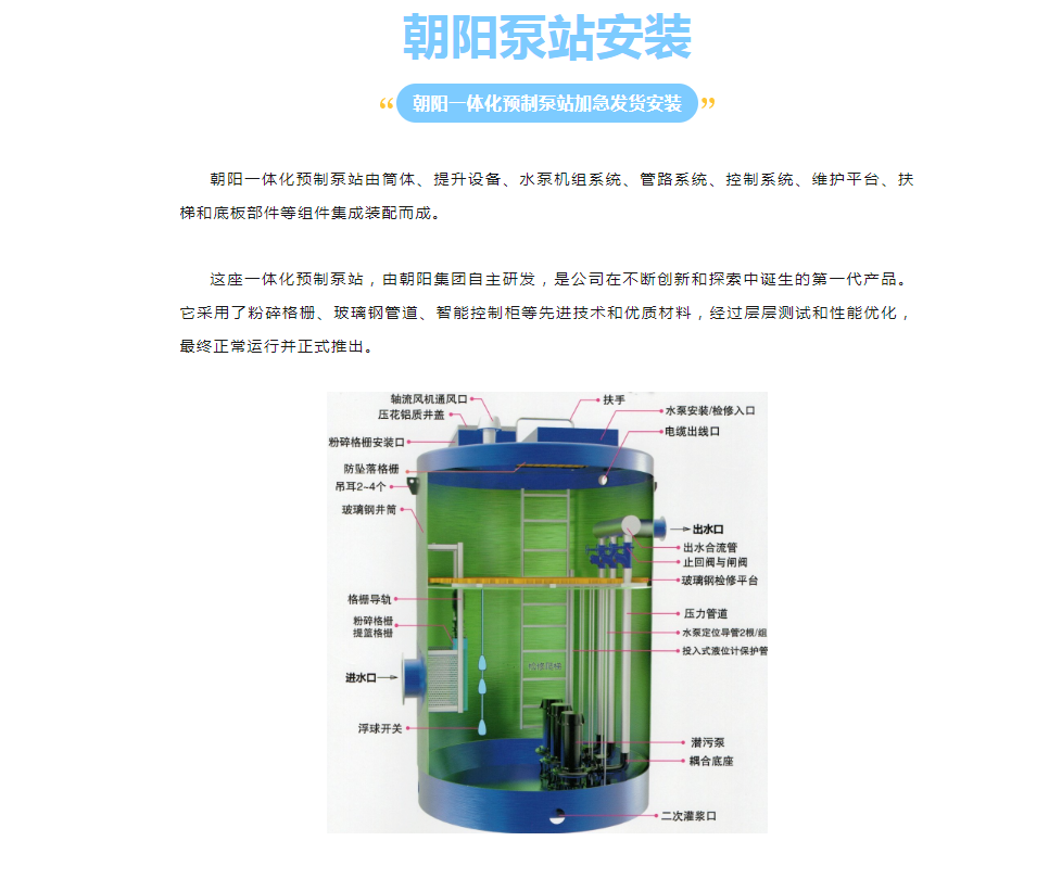 朝陽(yáng)一體化預(yù)制泵站多種款式,接受客戶(hù)要求定制。泵站常規(guī)直徑1.2-4.2m,筒體高度1.6-24m,進(jìn)出口徑50-500mm,流量范圍10-5200m2/h,揚(yáng)程范圍5-65m。接受客戶(hù)按需制定方案。